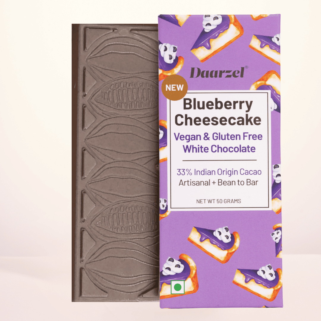 Craving the fun, luxurious combination of sweet and tart blueberry cheesecake? We’ve got you one better. Replicating the flavours of a creamy cheesecake and fresh blueberry compote in the smoothest Indian origin 33% cacao and 100 % vegan milk, this white chocolate bar is completely natural and gluten-free, making this chocolate bar your new favourite guilt-free dessert.