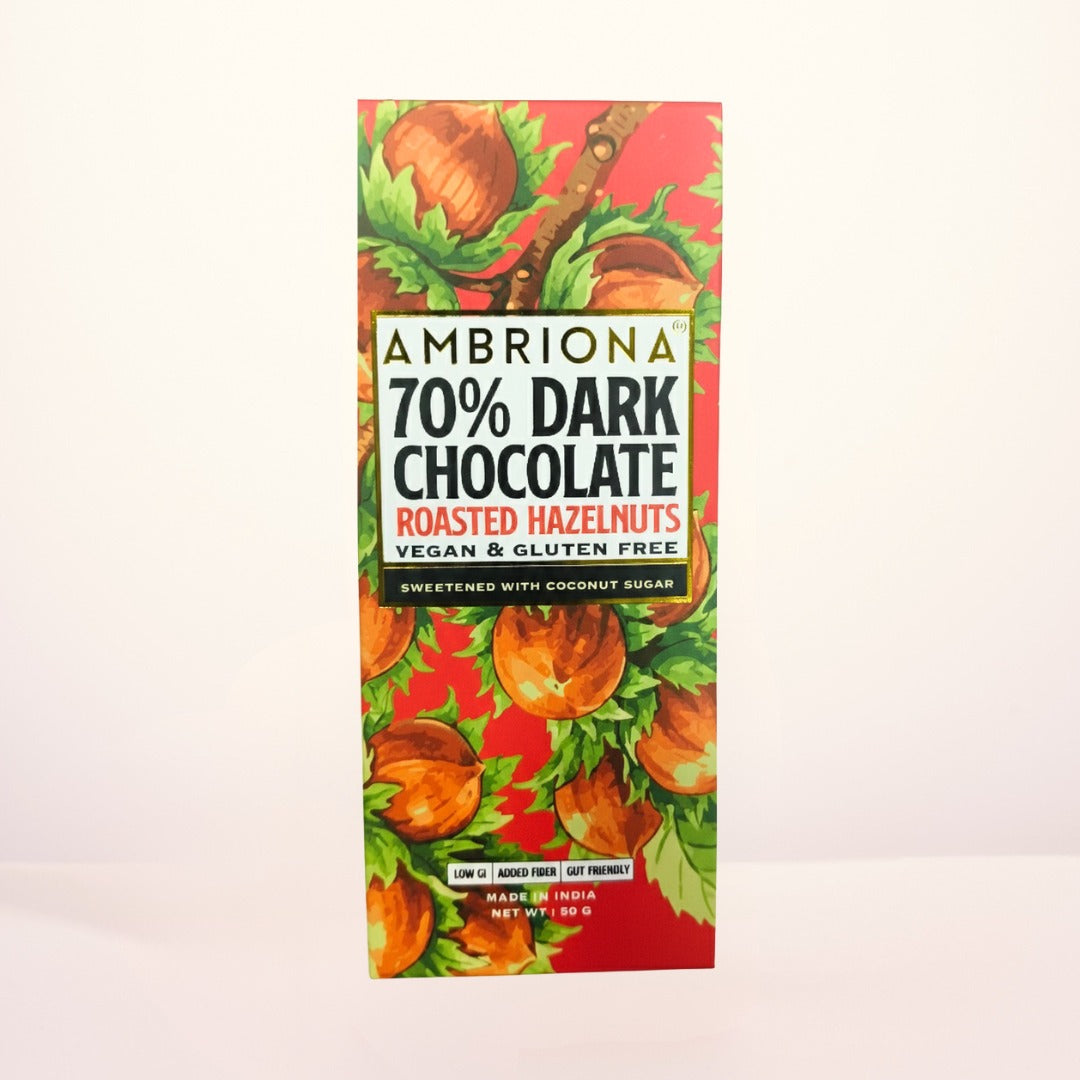 A match made in heaven, Ambriona’s 70% Dark Chocolate with Roasted Hazelnuts & Coconut Sugar is the perfect blend of bold and nutty. Made with Ambriona’s signature 70% rich dark chocolate that melts slowly in your mouth, each bite is packed with crunchy roasted hazelnuts and gently sweetened with natural coconut sugar. This vegan, gluten-free chocolate bar delivers deep cocoa intensity with a smooth, nutty finish, with pure indulgence in every bite.